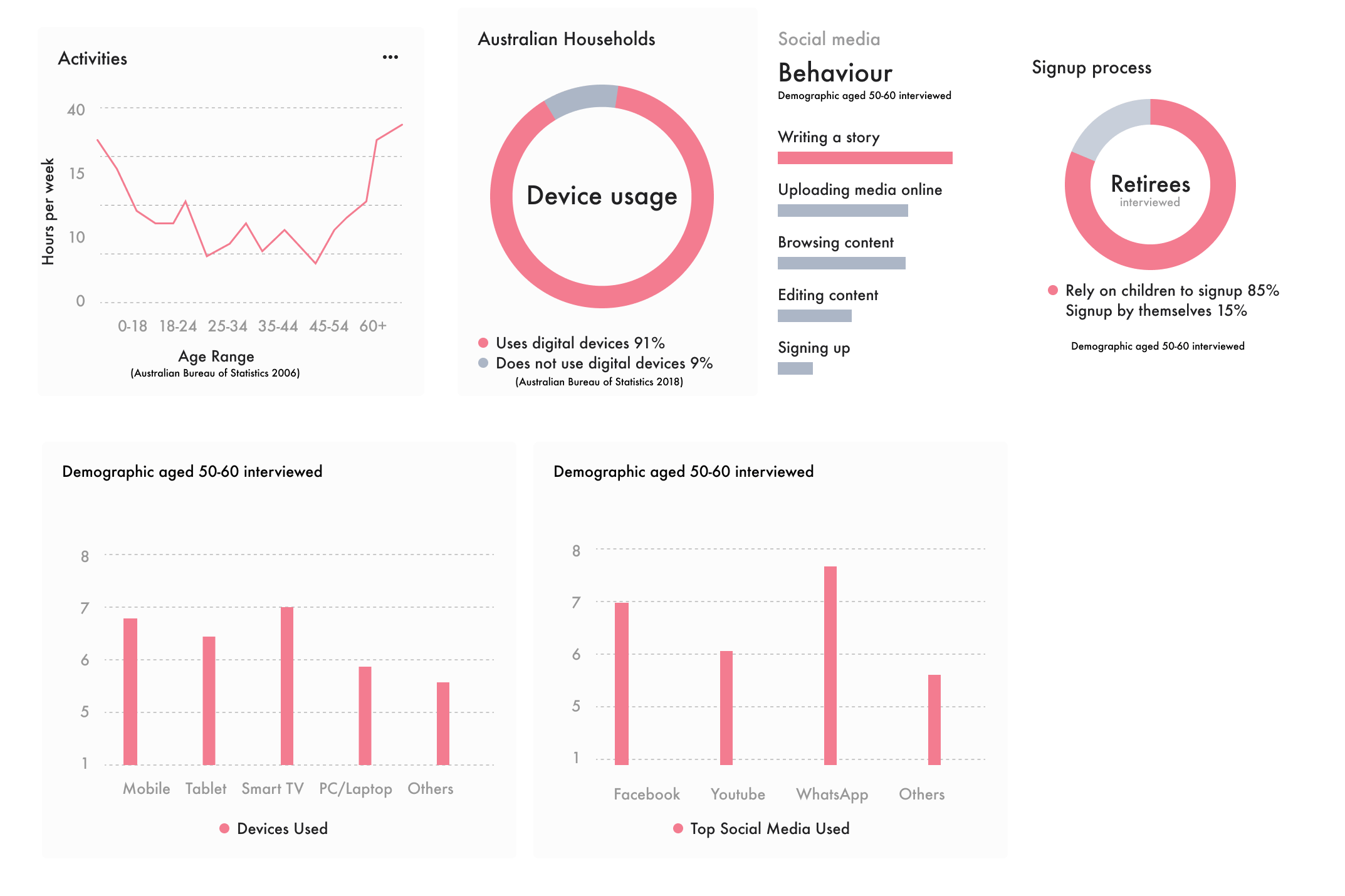We interviewed recently retired people and homemakers (housewives/househusbands) to understand their daily lives, hobbies, technology and social media usage, and their needs. In addition, we did more secondary research for Australians aged 55-65′ social trend and tech usage. Some patterns and key findings we discovered were: