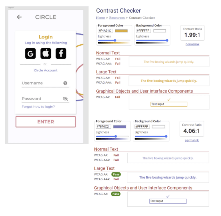 One of the valuable insights from the previous high-fidelity prototype was that some users found the text challenging to read on larger devices, primarily due to text size and color contrast. To address this, we utilized a contrast checker program, which revealed that the existing color scheme did not meet optimal wcag 2.1 accessibility standards. In response, we selected new colors, #504C94 and #4F4F4F, which significantly improved the contrast ratio while preserving the platform’s welcoming aesthetic. These color updates were applied to the finalized prototype, and additional enhancements, such as layout adjustments, were made to further improve readability and overall usability.