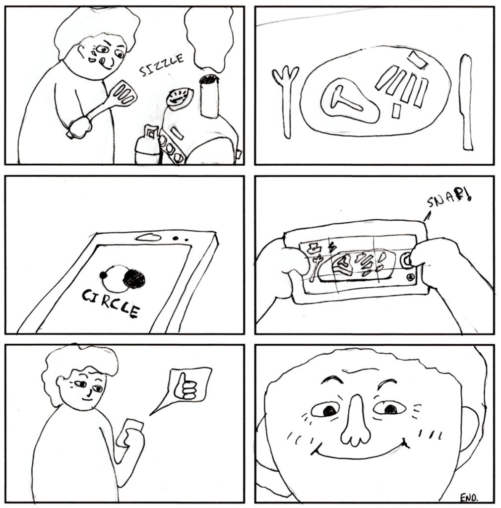 The Circle user is a 60 year old retiree who has just finished cooking a meal for themselves at home. As they are part of the homecooking Circle they decide to take a photo of the disk and share it with the group members. The Simple of inviting interface results in a seamless experience with the mobile app and they start to receive likes, comments and attention for their action.